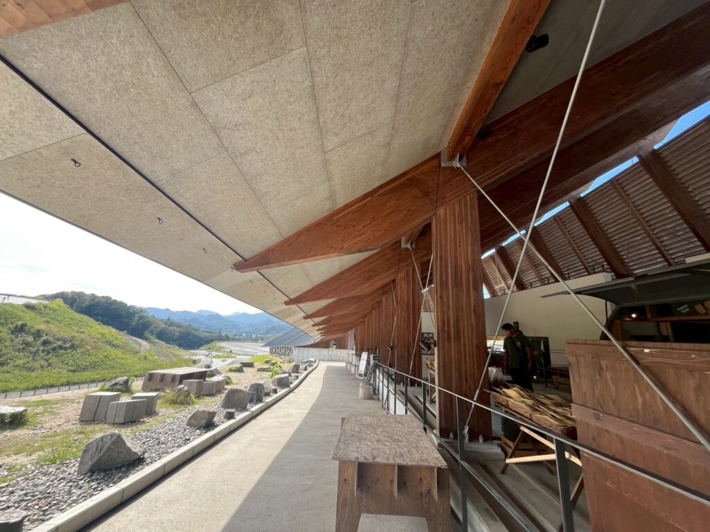 VISONの建築設計は、赤坂知也建築設計事務所が手掛けておられ、施設全体において、三重県産の杉を多用し、伊勢神宮の式年遷宮をモデルにした木造建築が特徴です。建物の設計には、「野に遊び、野に学べ」というテーマが反映されており、内外をつなぐ庇や縁側などの「中間領域」が巧みに取り入れられています。