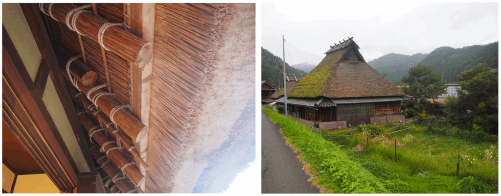 美山のかやぶき屋根の家は「入母屋造り(いりもやづくり)」という様式を持つものが多く、屋根の上部が前後に傾斜し、その下から四方に屋根が伸びる柔らかなカーブがとっても印象的でした!💭