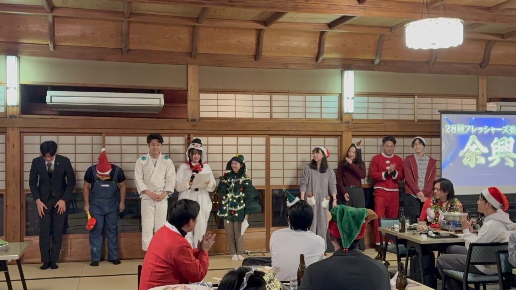 若手社員を中心とした出し物や、全員参加のプレゼント交換会など、