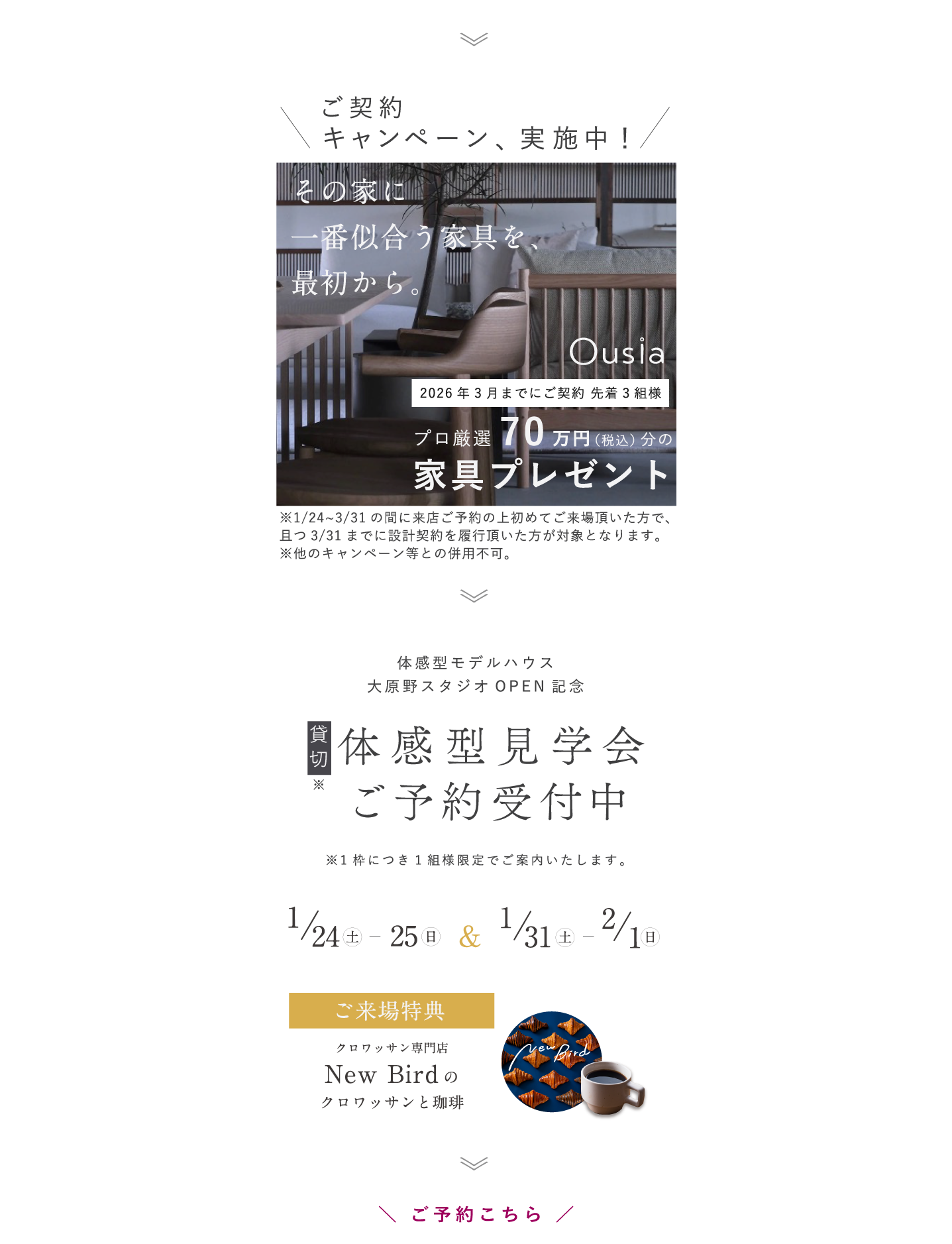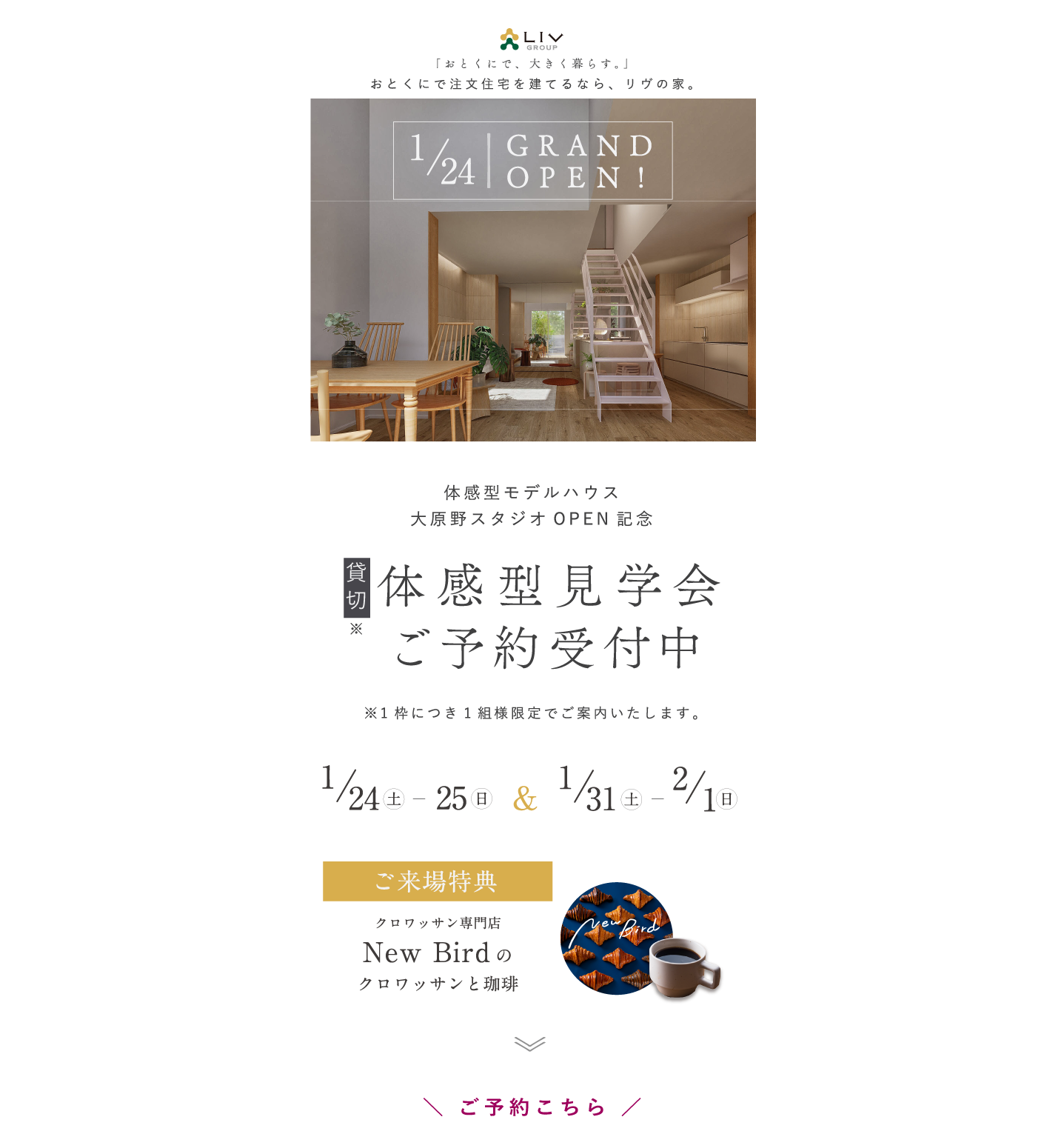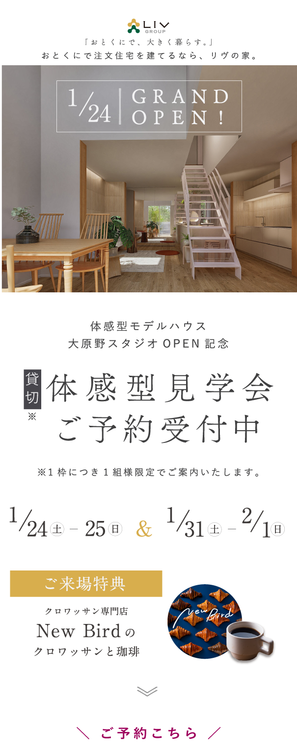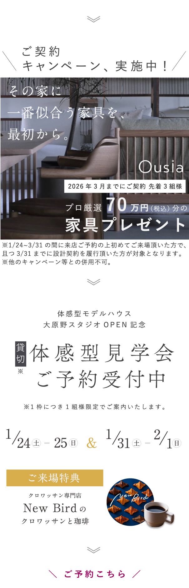 モデルハウス 1/24(土)-25(日)、1/31(土)-2/1(日)開催♪ 貸切 | 体感見学会ご予約受付中!1/24-25&1/31-2/1 場所 京都市西京区大原野 時間 10:00~15:00 参加方法 電話または予約フォームにて簡単1分予約♪ TOPイベント貸切 | 体感見学会ご予約受付中!1/24-25&1/31-2/1