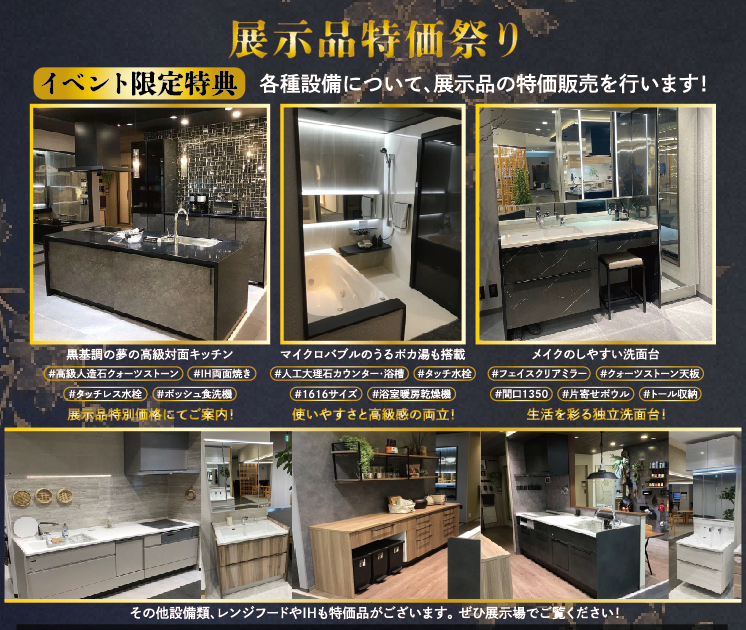 「展示品特価祭り」を同時開催しており、黒基調の高級対面キッチンやマイクロバブル搭載のバスルーム、クォーツストーン天板の洗面台などがイベント限定の特別価格で案内されます