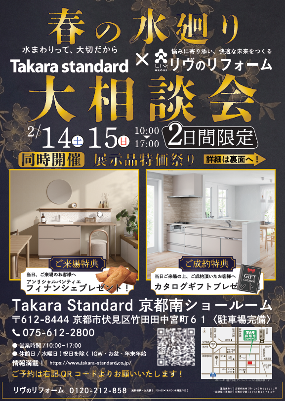 京都おとくに地域で28年、地元で愛される「リヴのリフォーム」と、114年の歴史を持つ「タカラスタンダード」のコラボイベントなので、安心して相談いただけます