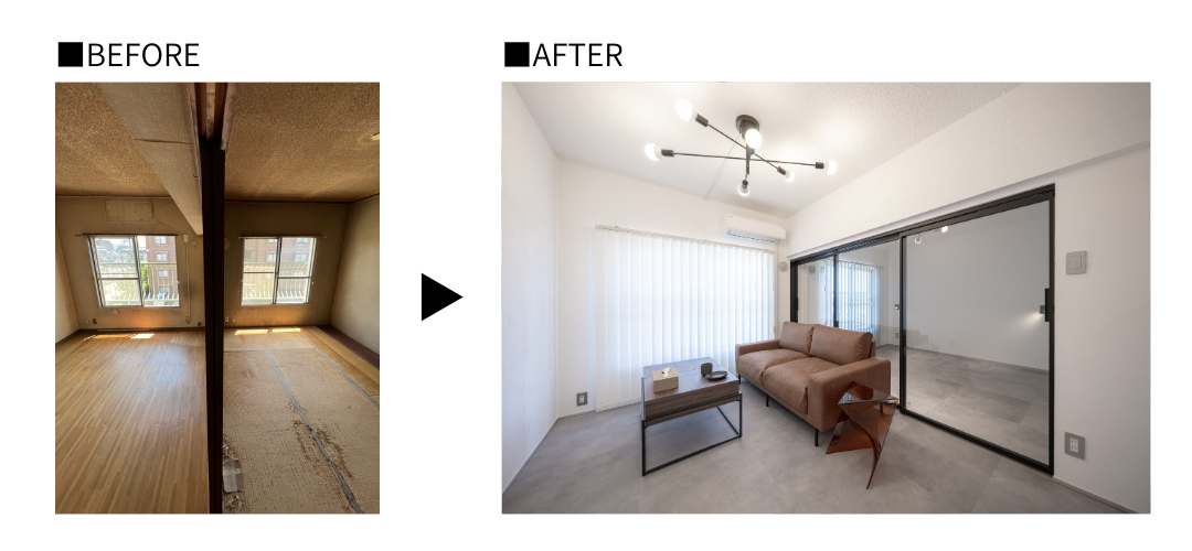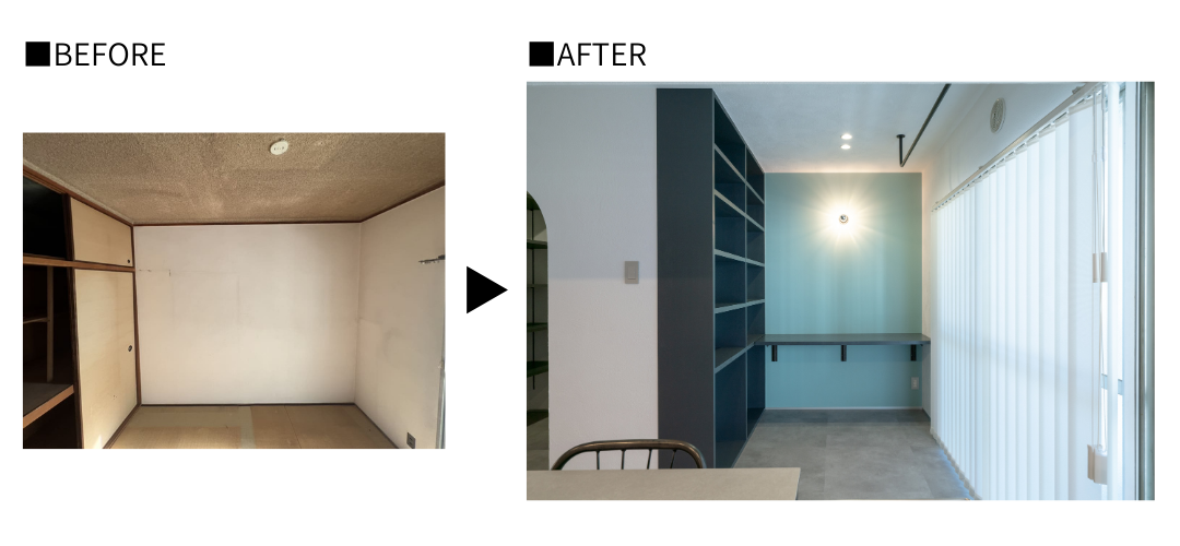 ミラタップのアルミガラス建具により、視線が抜け、空間全体をより広く感じられる間取りへと生まれ変わりました。