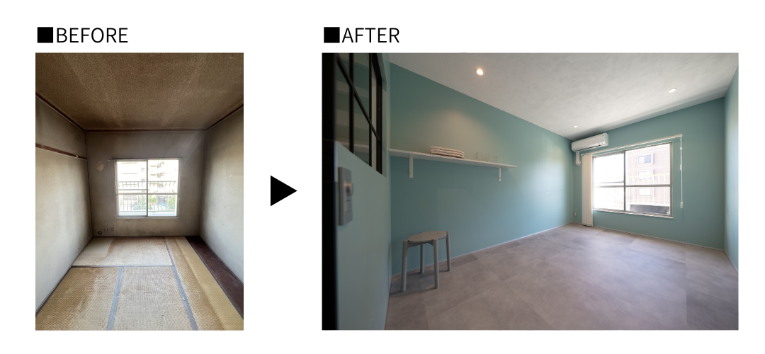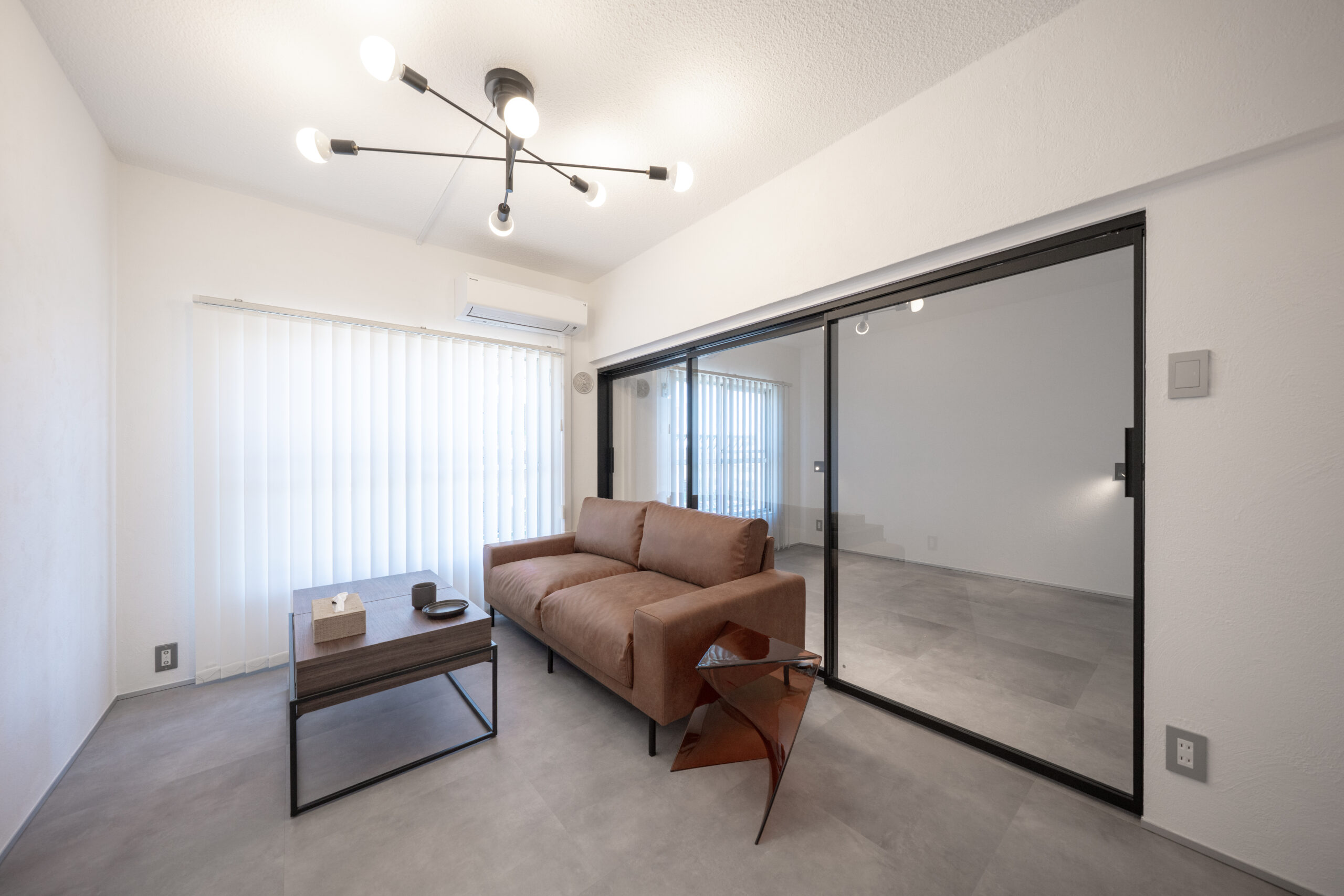 撤去可能な壁を取り払い、手前をリビング、アルミガラス建具を挟んで奥に寝室を配置。