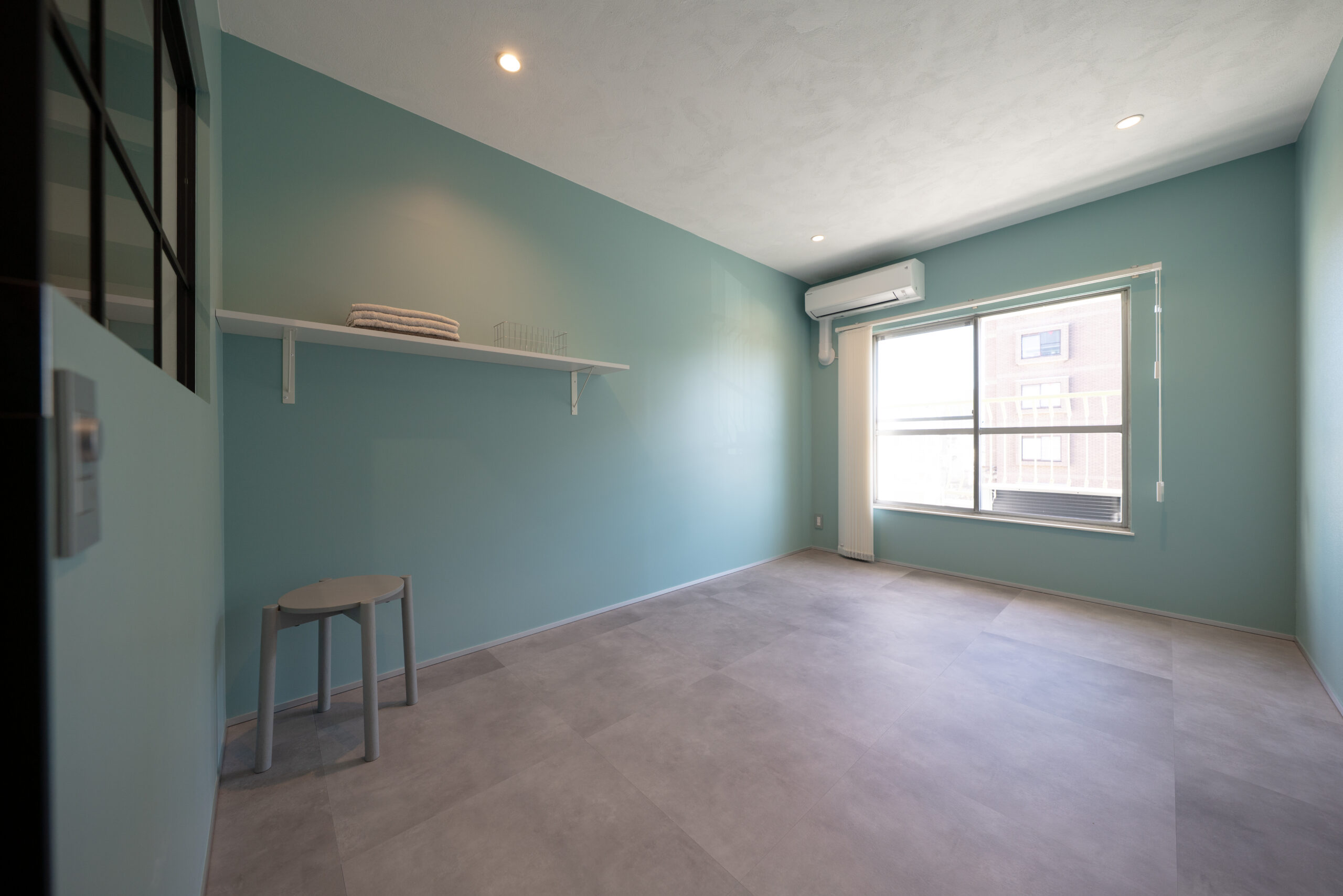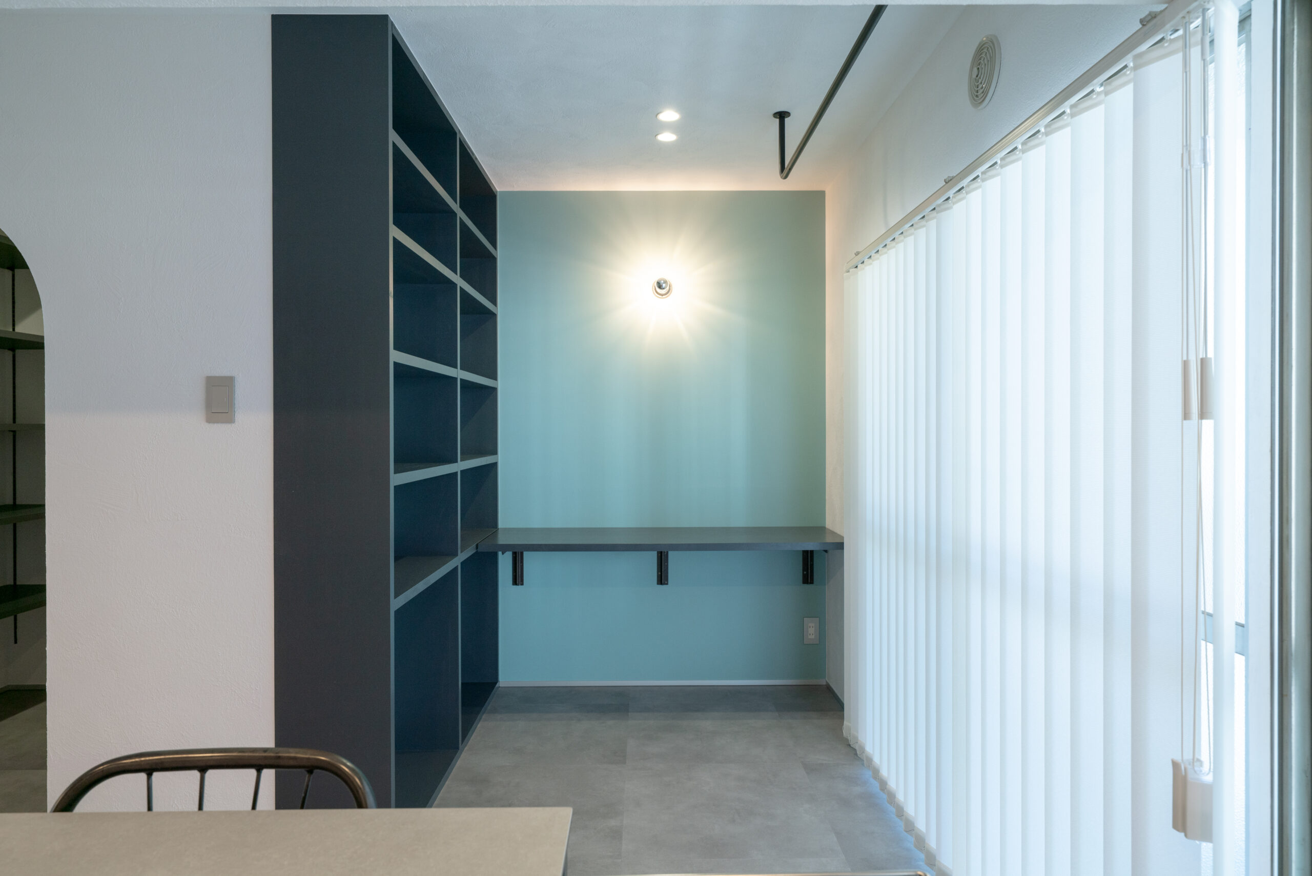 壁全面を書斎と同じミントグリーンで塗装し、やさしく包み込まれるような、心落ち着く雰囲気に仕上げました。