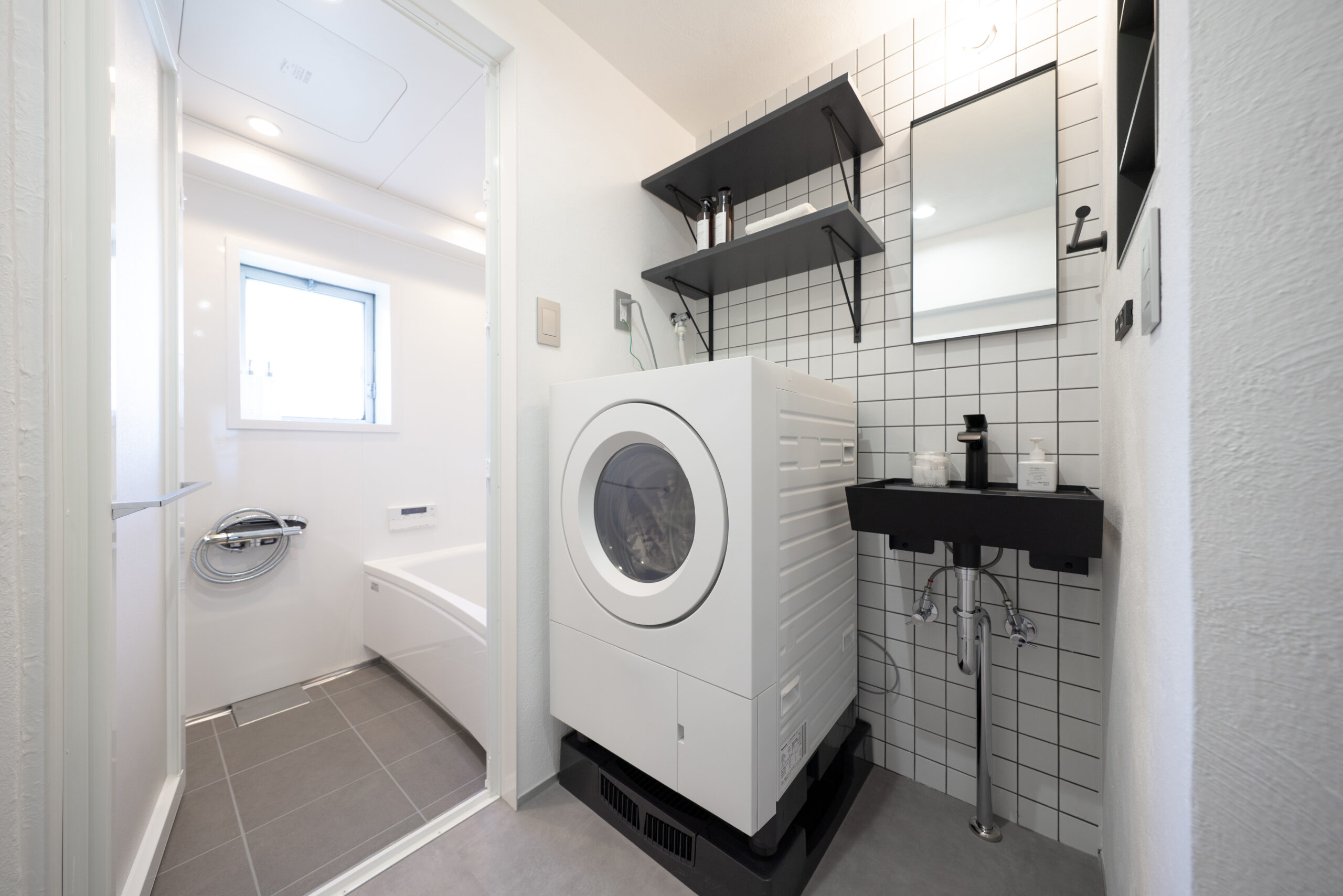 洗面まわりはミラタップの商品を中心に採用し、統一感のあるすっきりとした印象に。