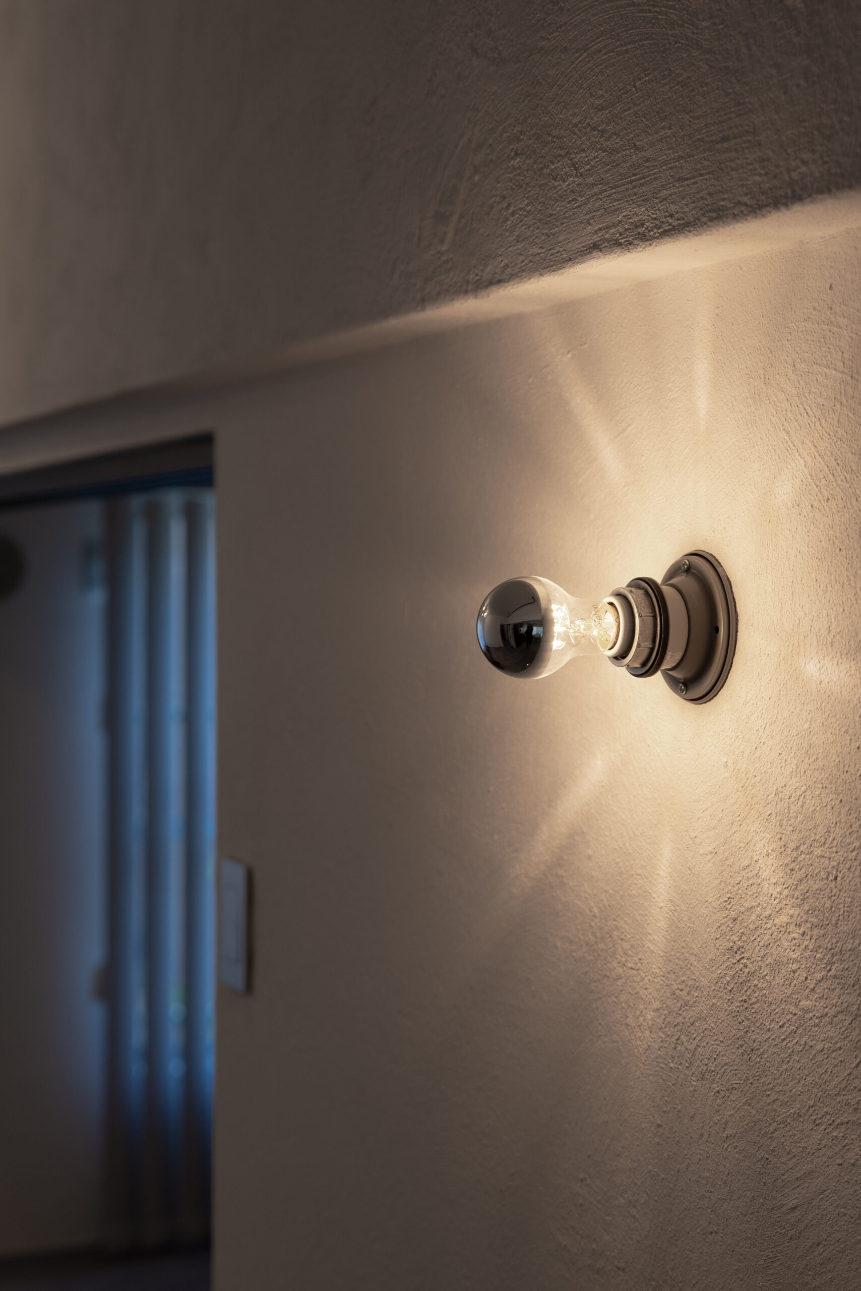 ブラケットライトの光が反射し、壁の色味と質感を美しく引き立てています。